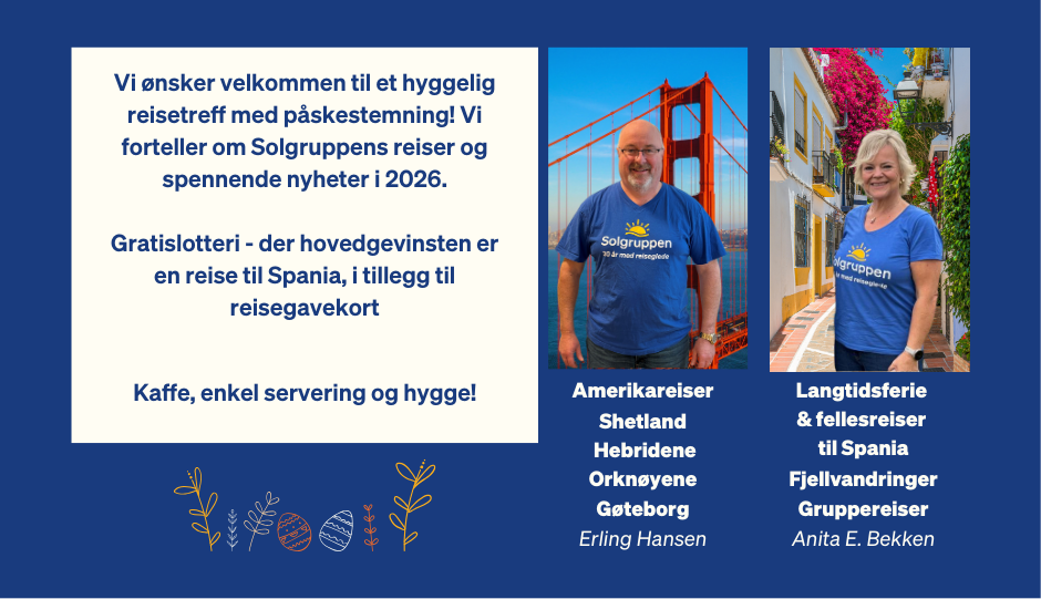 Velkommen til reisetreff i Trondheim! -med utlodning av reise til Spania! Tirsdag 17. mars Kl. 14:00 Hornemannsgården, Trondheim Påmeldingsskjema Navn Antall personer E-post Telefon Jeg har lest og forstått Solgruppen personvernerklaering Jeg vil motta Solgruppens nyhetsbrev Meld meg på