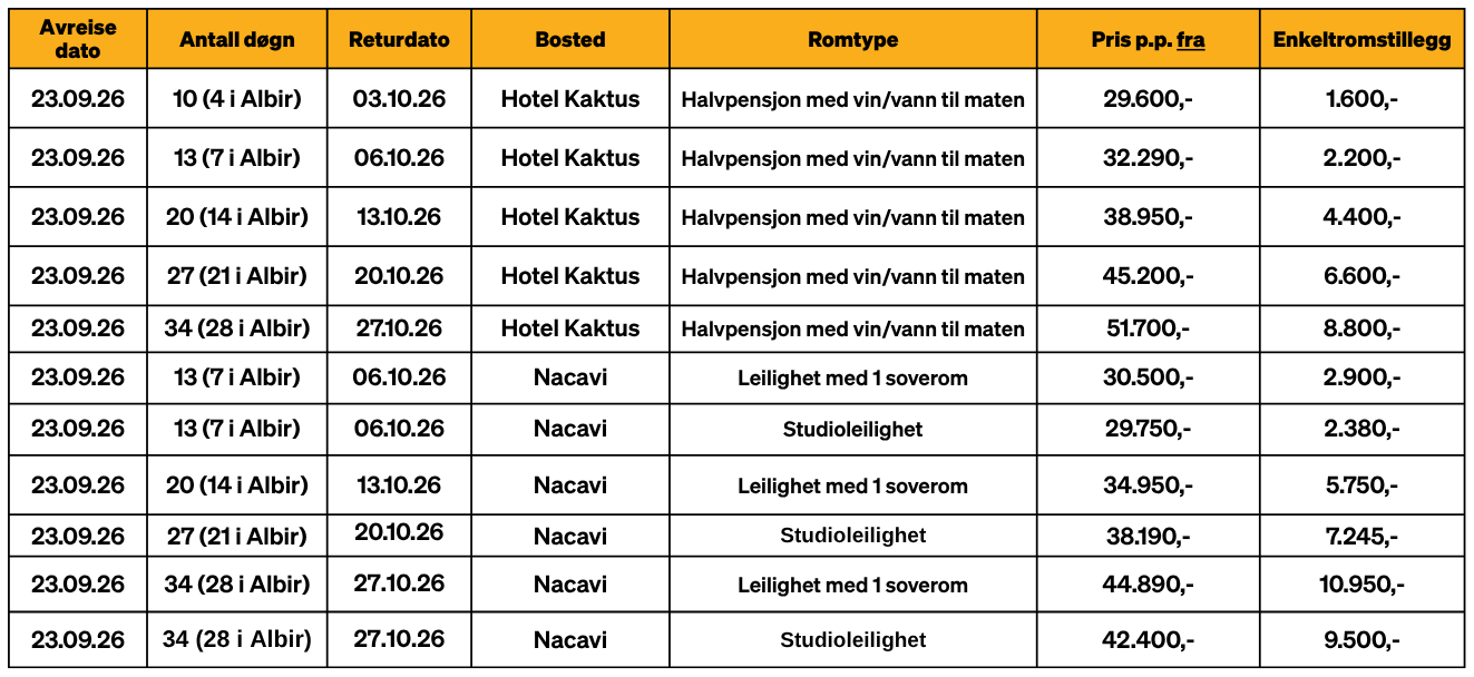 *Bestill før 01.05.26 og få kr 1000 i rabatt eller kr 2000 om du er i over 4 uker. Rabatten trekkes i fra oppgitt pris.